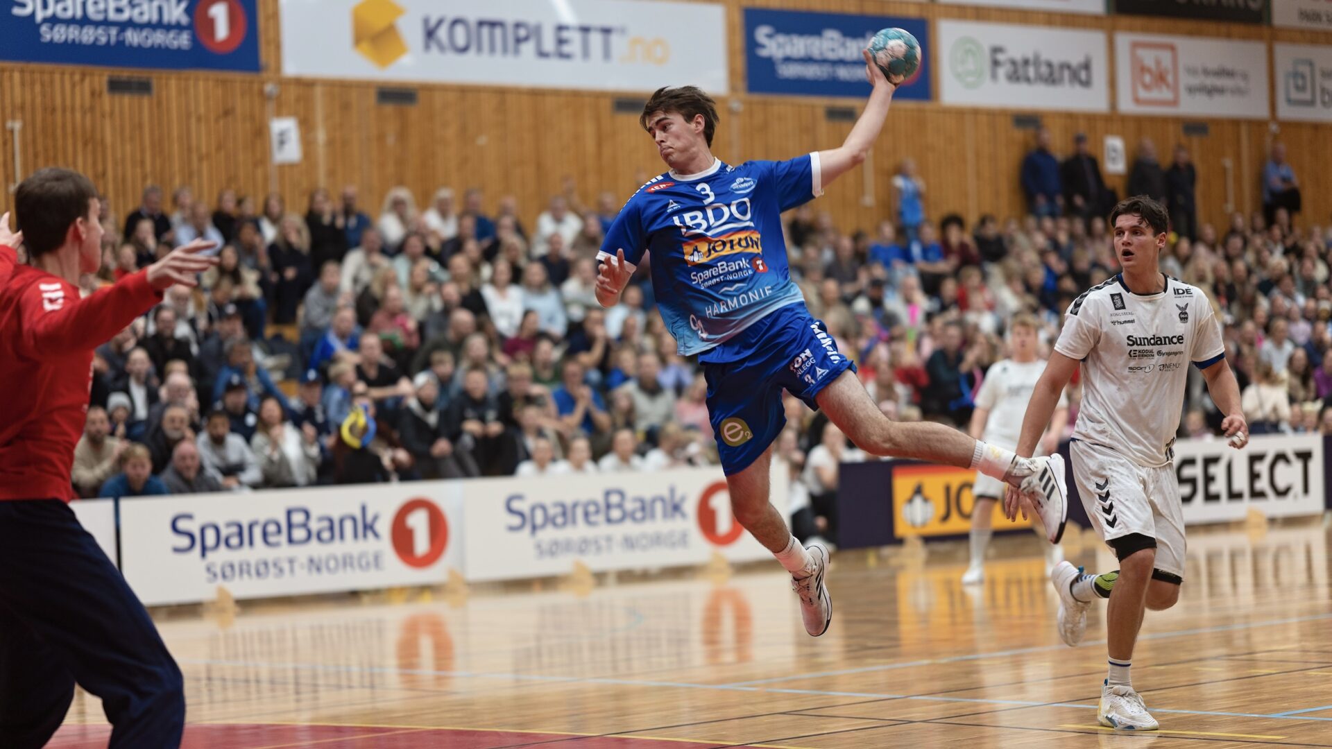 Vi vil ha mer fest i Jotunhallen! Her ser vi Endre Svåsand i aksjon mot Falk.