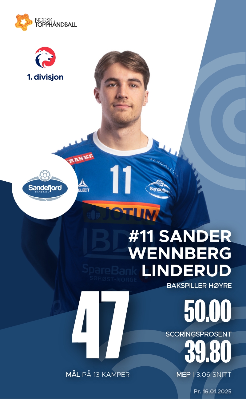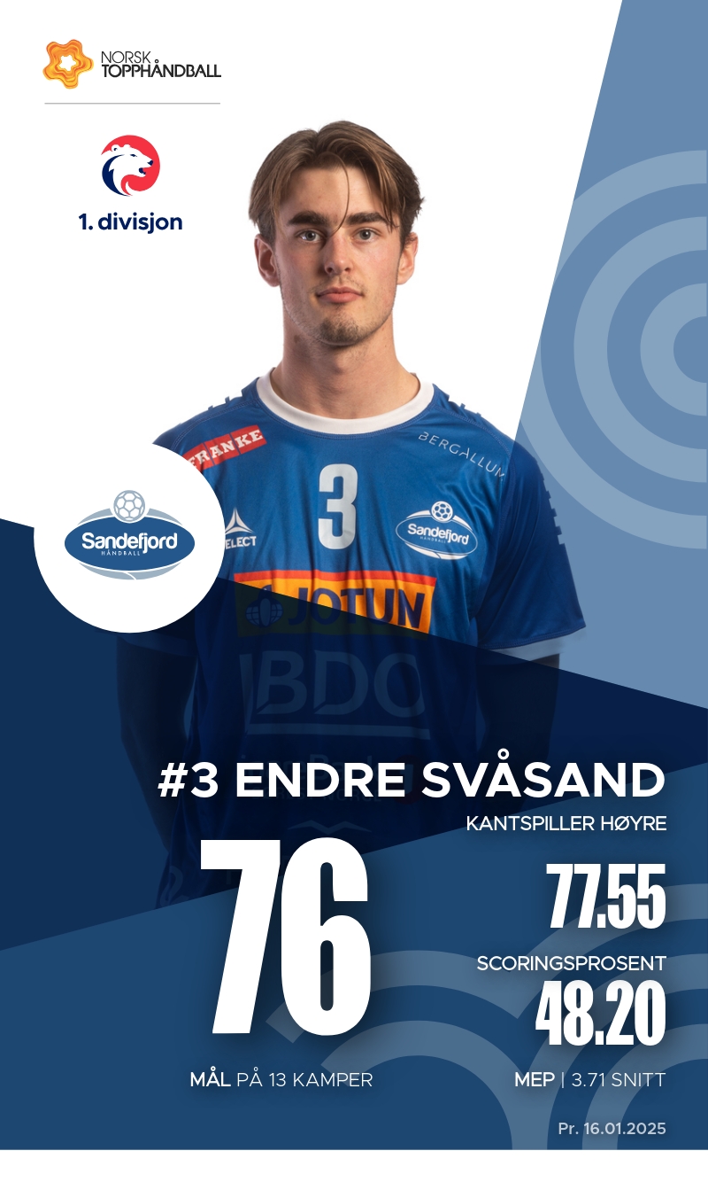 Sandefjord har flere nøkkelspillere som bidrar sterkt til lagets prestasjoner i 1. divisjon. Endre Svåsand har vært lagets toppscorer med 76 mål og 8 assists, noe som gir ham en MEP på 3.7. Sander Wennberg Linderud følger opp med 47 mål og imponerende 92 assists. Sander Sæterhaug Rønning har også gjort seg bemerket med 45 mål og 5 assists.